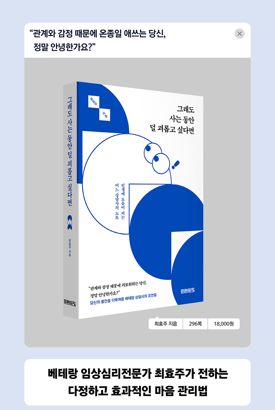 이 타래를 엮어서 만든 책이 발간이 되었습니다. 제목은 '그래도 사는 동안 덜 괴롭고 싶다면' 입니다. 2024년 8월에 '미래의 창' 출판사를 통해 출간되었습니다. e-book으로도 보실 수 있습니다.