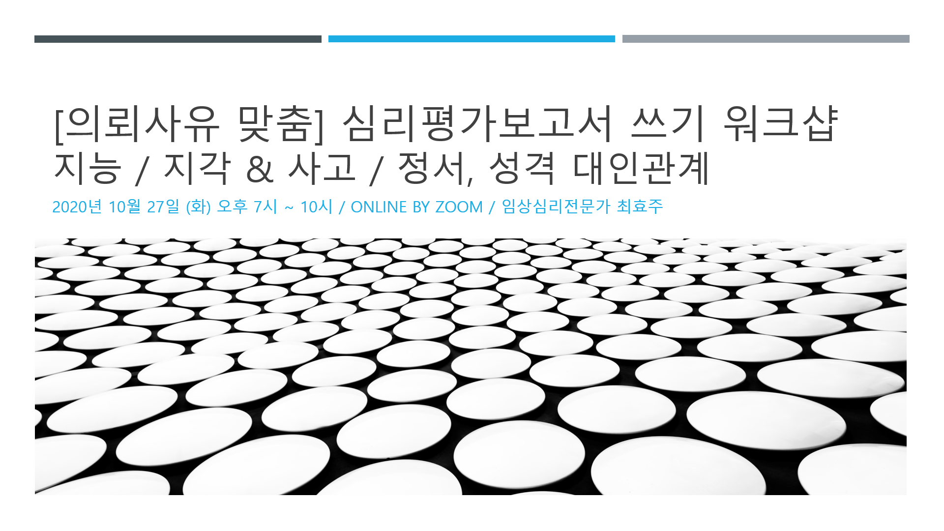 | (모집 마감) [의뢰사유 맞춤]심리평가 보고서 작성법 온라인(zoom) 워크샵 (1) - 의뢰사유/행동관찰 & 요약과 제언 부분 (0) | 2020.09.25 |