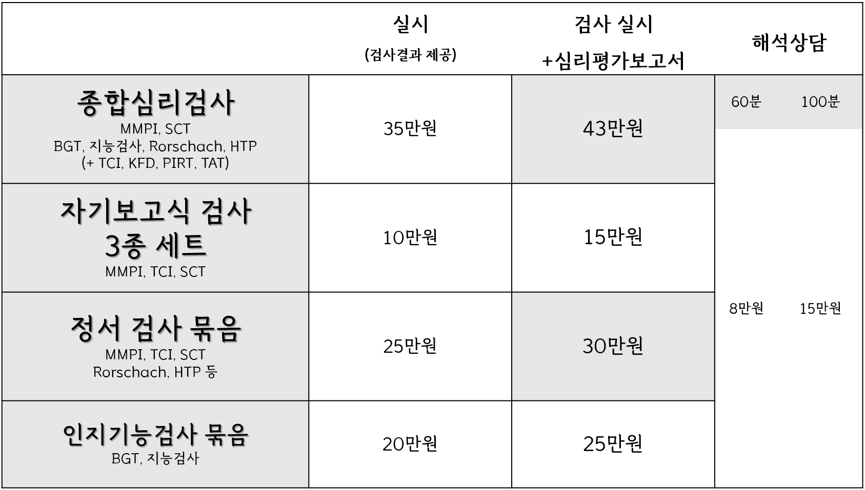** 해석상담 비용은 기본 8만원입니다. 다만 검사 구성 및 해석상담 소요 시간을 고려해서 해석상담 비용은 6만원 ~ 10만원으로 차등 적용됩니다.
