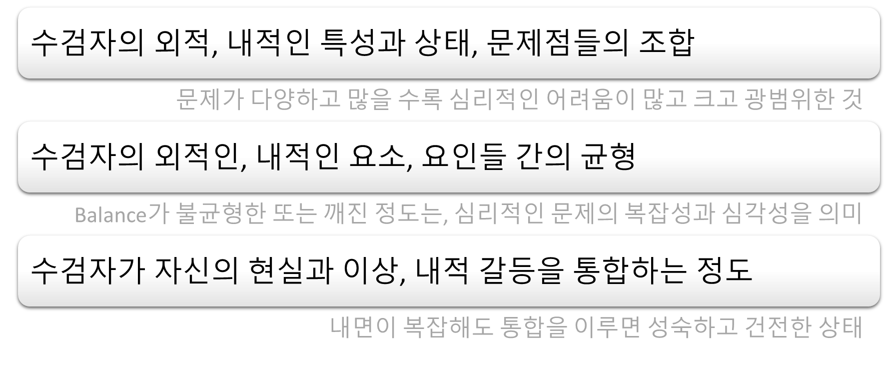 그래서, 개인의 심리적인 건강, 심리적 성숙의 지표는 내적인 갈등 상태의 '조합'과 '균형'과 '통합'이라고 볼 수 있을 것 같다.