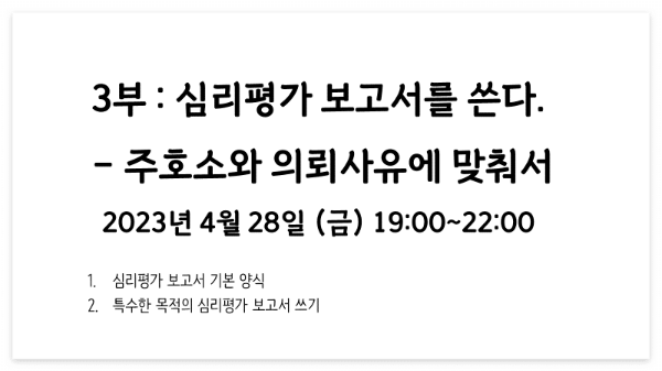 4월 28일 금요일 저녁 19:00~22:00 : 주호소 및 의뢰사유에 맞춰 심리평가보고서 쓰기(+특수한 목적의 보고서 쓰기)