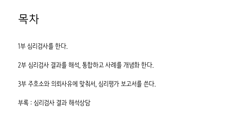그리고, 의뢰사유 부분을 정리하고 기술하는 방식, 행동관찰 부분을 기술하는 방식과 유의 사항들을 찬찬히 설명드린 후, 이를 토대로 '요약 및 제언' 부분을 기술하는 요령까지 이 시간에 다룰 예정입니다.