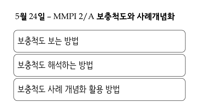 두 번째 시간인 5월 24일에는 MMPI-2/A에서 활용을 잘 안 하게 되는 보충척도에 대해 집중적으로 다룹니다. MMPI-2/A의 보충척도의 기능에 대해 확인하고, 보충척도를 '보고', '활용'하는 방법에 대해 자세히 다룰 예정입니다. 그리고 보충척도를 통해 사례개념화를 진행하는 과정에 대해 소개를 해드리려고 합니다.